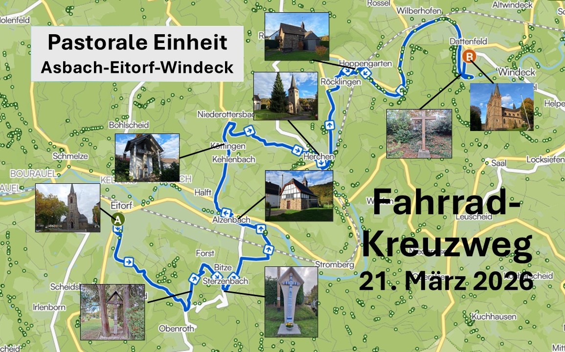 Am Samstag, den 21. März 2026 findet in der Pastoralen Einheit Asbach-Eitorf-Windeck ein geführter Fahrradkreuzweg statt. Wir laden wir ein, die Tradition des Kreuzwegs Jesu in der Fastenzeit mit allen Sinnen neu zu entdecken.