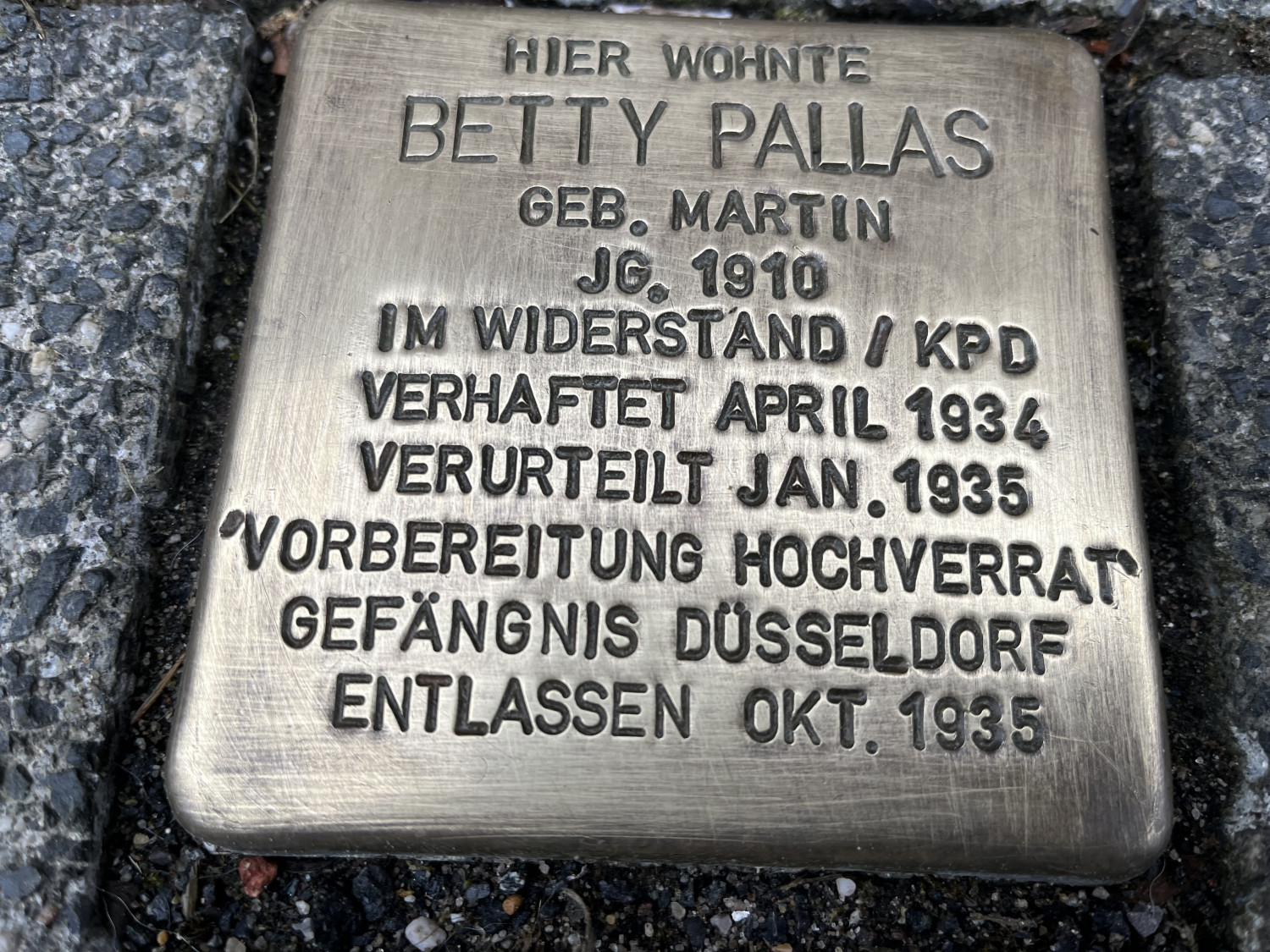Roonstraße 14: Betty Pallas, geboren 1910, ging früh in den Widerstand gegen das NS-Regime, war in der KPD aktiv, wurde mit 24 Jahren 1934 verhaftet wg. Hochverrat, kam ins Gefängnis nacch Düsseldorf; wurde dort 1935 entlassen.