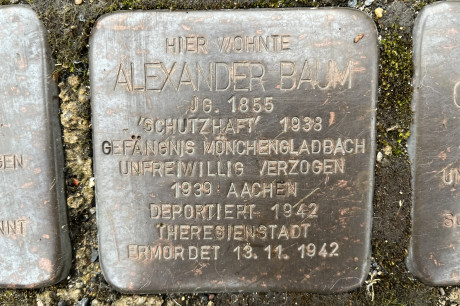 Alexander Baum wurde am 23.05.1855 als Sohn von Joseph Baum und Henriette Baum, geb. Blech (oder Bleeck) in Elsdorf geboren, als Beruf wird Lehrer angegeben. Er heiratete Rebecka Behr, von sechs Kindern sind zwei Töchter bekannt: Frieda und Caroline. Nach einer Schutzhaft von Alexander im Gefängnis Mönchengladbach (1938) muss die Familie im Jahr 1939 unfreiwillig nach Aachen umziehen. Am 25.07.1942 wird Alexander mit dem Transport VII/2, Zug Da 71, No. 10 von Aachen ins Ghetto Theresienstadt deportiert, wo er am 13.11.1942 ermordet wurde.
