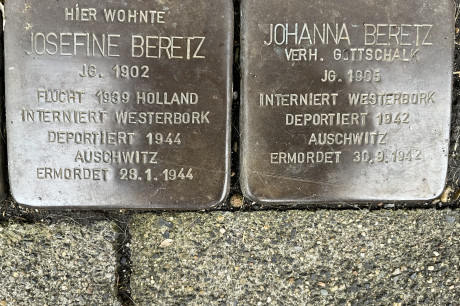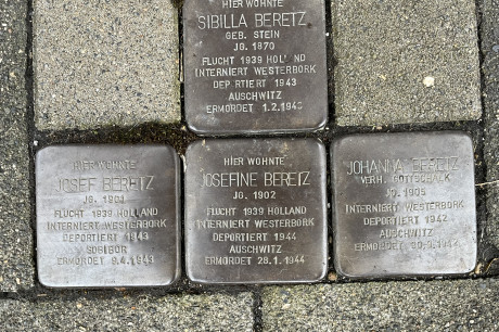 Friedenstraße 81: Sibilla Stein wurde am 17.04.1870 als Tochter von Lazarus Stein und Regina Stein, geb. Levy in Gindorf geboren, sie heiratete Alexander Beretz (*20.08.1856, †unbekannt), drei Kinder sind bekannt: Josef, Johanna und Josefine. Nach der Flucht im Jahr 1939 nach Holland wurde Sibilla im Durchgangslager Westerbork interniert. Von dort aus wurde sie im Jahr 1943 ins KZ Auschwitz deportiert, wo sie am 01.02.1943 ermordet wurde.