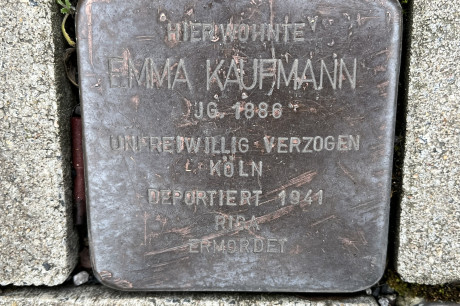 Emma Kaufmann wurde am 21.02.1886 als Tochter von Lazarus Kaufmann und Sara Kaufmann, geb. Baruch in Gindorf geboren. Nach einem unfreiwilligen Umzug nach Köln wurde Emma am 07.12.1941 ab Köln ins Ghetto Riga deportiert, wo sie ermordet wurde.