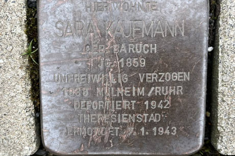 Friedenstraße 77: Sara Baruch wurde am 22.10.1859 als Tochter von Abraham Baruch und Clara Baruch, geb. Moses in Oberbieber geboren, sie war verwitwet, Name des Ehemanns war Lazarus Kaufmann, folgende Kinder sind bekannt: Emma. Als Beruf von Sara wird Geschäftsfrau angegeben. Nach dem unfreiwilligen Umzug im Jahr 1938 nach Mülheim an der Ruhr wurde Sara am 21.07.1942 mit dem Transport VII/1, Zug Da 70, No. 423 ab Düsseldorf ins Ghetto Theresienstadt deportiert, wo sie am 07.01.1943 ermordet wurde.