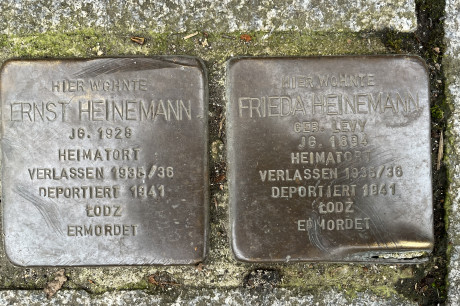 Ernst Heinemann wurde am 31.10.1928 als Sohn von Alfred Heinemann und seiner Ehefrau Frieda Heinemann, geb. Levy in Grevenbroich geboren, eine Schwester (Margot) ist bekannt. Die Familie verließ – sehr wahrscheinlich unfreiwillig – den Heimatort und verzog 1935/36 nach Köln. Ernst wurde am 30.10.1941 mit dem Transport 342 I/382 von Köln ins Ghetto Litzmannstadt verbracht und von dort im Mai 1942 ins Vernichtungslager Kulmhof deportiert, wo er ermordet wurde. Er wurde nur 14 !! Jahre alt.