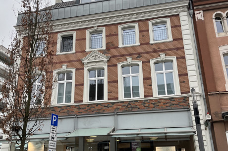 Breite Straße 18: Alfred Heinemann wurde am 29.01.1886 als Sohn von Max Heinemann (*11.08.1855, †24.05.1924) und Henriette Heinemann, geb. Anger in Grevenbroich geboren. Alfred heiratete am 13.08.1923 in Haaren Frieda Levy, zwei Kinder sind bekannt: Margot und Ernst. Alfred besaß ein Herren- und Damenkonfektionsgeschäft in Grevenbroich. Die Familie verließ – sehr wahrscheinlich unfreiwillig – den Heimatort und verzog 1935/36 nach Köln. Alfred wurde am 30.10.1941 von Köln ins Ghetto Litzmannstadt verbracht und von dort im Mai 1942 ins Vernichtungslager Kulmhof deportiert, wo er ermordet wurde (strittig: Diese Quelle nennt das Ghetto Theresienstadt als Ziel der Deportation und Todesort). Er wurde 56 Jahre alt.