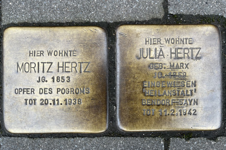 Julia Marx wurde am 05.11.1859 als Tochter von Moises Marx (*06.12.1823, †14.07.1905) und Johanna Marx, geb. Hirsch (*02.04.1831, †27.11.1901) in Alsdorf geboren. Sie heiratete am 09.05.1884 in Würselen Moritz Hertz, Kinder sind nicht bekannt. Julia wurde in die Heilanstalt Bendorf-Sayn eingewiesen, wo sie am 11.02.1942 – kurz vor der Deportation aller Insassen – verstarb. Sie wurde 83 Jahre alt.