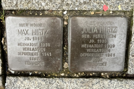 Julia Flörsheim wurde am 20.04.1900 als Tochter von Isaak Flörsheim und Sara Flörsheim, geb. Sommer in Bad Wildungen geboren. Sie heiratete Max Hirtz, Kinder sind nicht bekannt. Nach einem – sehr wahrscheinlich unfreiwilligen – Umzug nach Köln, Mühlgasse 89 im Jahr 1939 wurde Julia am 22.10.1941 ab Köln ins Ghetto Litzmannstadt verbracht und von dort aus im Mai 1942 ins Vernichtungslager Kulmhof deportiert, wo sie umgebracht wurde.