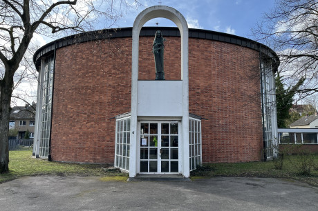 Goethestraße in Marienburg: Die Kirche St. Maria Königin in der Goethestr. 84 ist schön gelegen in einer kleinen Parkanlage in Marienburg am südöstlichen Rand des Seelsorgebereichs. Erbaut von Dominikus Böhm, ist sie die "jüngste" der fünf Kirchen.