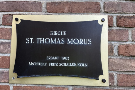 am Ende des Clarenbach-Kanals: Zusammen mit dem in den 1920er Jahren auf dem ehemaligen Festungsring realisierten Inneren Grüngürtel entstand der Aachener Weiher und der von ihm nach Westen führende Lindenthaler Kanal. An der westlichen Stirnseite des 1925 angelegten Kanals baute der Düsseldorfer Architekt Franz Schneider 1934-36 eine erste Kirche. Starke Kriegsschäden wurden bis 1954 durch den Wiederaufbau nach Plänen von Kobes Bong beseitigt. Statische Mängel erforderten schon bald einen Neubau. Den beschränkten Wettbewerb zwischen den Architekten Gottfried Böhm, Paul Schneider-Esleben und Hans Schwippert entschied Böhm 1964 für sich, 1968-70 entstand der heutige Bau auf der Basis überarbeiteter Pläne.