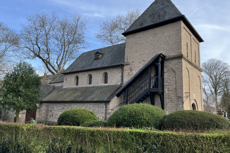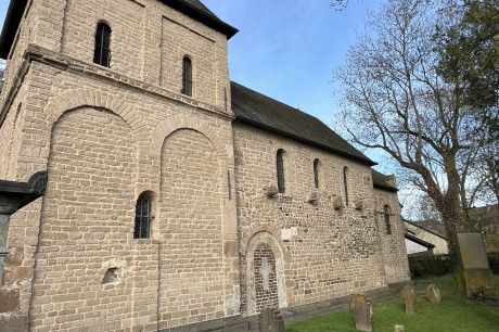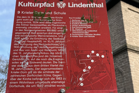 Freiligrathstraße: Es könnte hier tatsächlich bereits im 8. Jh. eine Holzkirche gegeben haben, in der Kaiser Karl der Große in der erwähnten Legende Hildebold traf. Als Beleg dafür wird das Stangenkreuz des 8. Jh., das als Scheitelstein über dem Westportal eingemauert ist, angesehen. Einer von zwei weiteren ehemaligen Grabsteinen, die in der Südwand vermauert sind, wird ans Ende des 9. Jh. datiert (Volutenkreuz). Die sichtbare Zweitverwendung dieser Steine als Baumaterial lässt aber auch daran denken, dass sie aus anderem Zusammenhang stammen, zum Beispiel aus der Umgebung von St. Gereon (G. Binding). Der Legende nach gehörte der Krieler Hof seit dem 8./9. Jh. zu diesem Stift, was aber 1155 erstmals urkundlich genannt wird. Die erste (bisher) bekannte Urkunde für die Kirche stammt erst von 1224, als ihre Pfarrrechte und die Zugehörigkeit zu St. Gereon beglaubigt wurden.